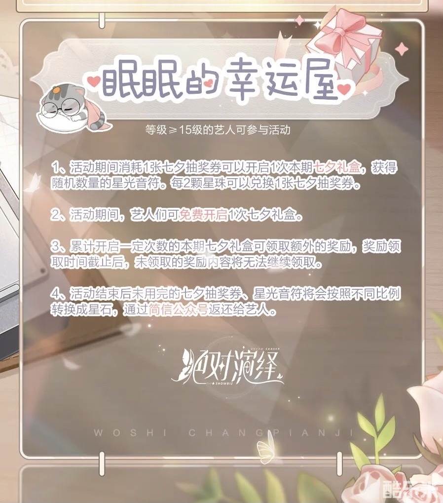 在活动期间,猫咪眠眠还将开启【幸运屋】和【礼品店】。玩家使用星珠兑换七夕抽奖券,即可在幸运屋中开启七夕礼盒,获得随机数量的星光音符。艺人们可以免费开启一次七夕礼盒,累计开启一定次数的礼盒便可获得额外奖励。