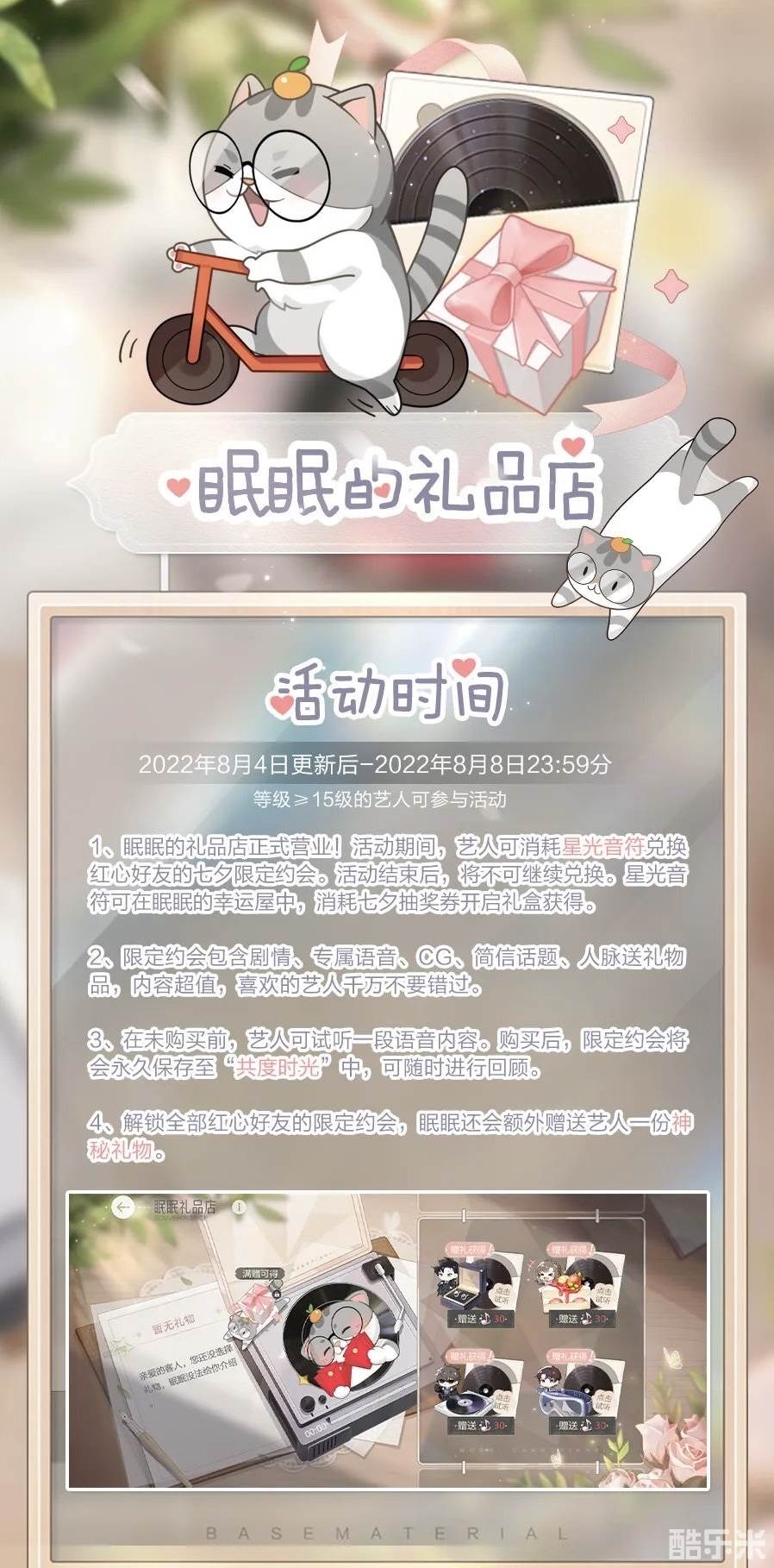 而在礼品店中,玩家则可以消耗星光音符兑换红心好友的七夕限定约会,约会包含剧情、CG、专属语音、简信话题以及人脉送礼物品。在未购买前,艺人们可试听一段语音内容,解锁后,限定约会将会永久保存在“共度时光”中,玩家可以随时回顾这一段甜蜜时光。解锁完全部红心好友的限定约会,女明星们还将获得由眠眠送上的神秘大礼!