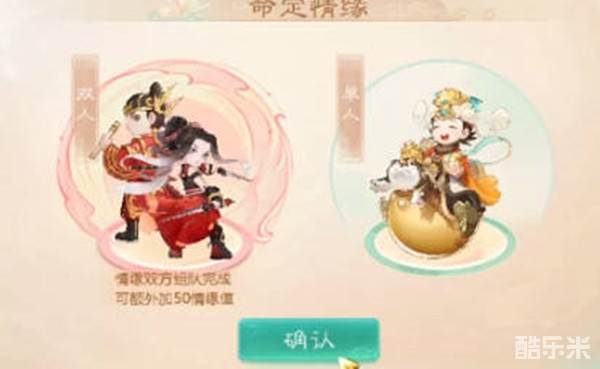 1:三生情缘1、双人组队,性别不限,建议固定队队友。2、前往月老,对话“结缘”即可。3、单人也可完成情缘任务,单只获得单人情缘积分,可以与未完成的人结缘一起完成,获得满额情缘值。4、可解除结缘,不过解除的一方将清空情缘值!被解除的一方保留个人情缘值。5、组队完成每日目标(日常副本)即可获得情缘值,领取情缘值累计奖励。