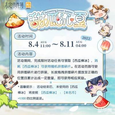 玩家需要在活动期间完成限时活动任务,可领取【西瓜棒冰】,消耗【西瓜棒冰】可获得随机拼图碎片;