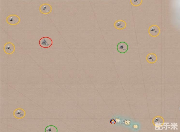 地图上红色为海龙号,绿色为白鲸号,橙色为飞鱼号。