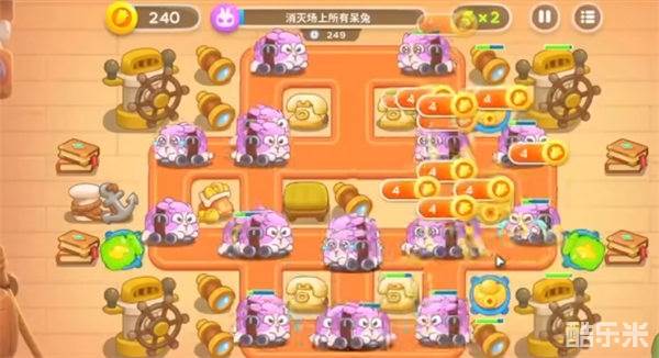 2.首先玩家可以在左侧和上方放置一些防御塔,其中包括多重箭,卫星和船锚各一个,清理掉右侧道具之后,继续补充卫星。