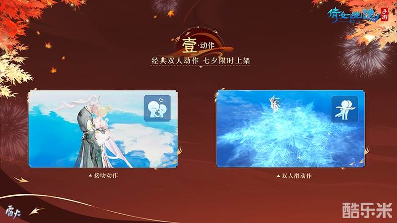 七夕活动期间,经典浪漫接吻动作、双人滑动作限时回归!8月3日-8月7日,50级及以上玩家可邀请一位好友共植瑶树,获取姻缘值,参与排行榜,赢限定豪礼!8月8日0点将对排行榜进行结算,第1名将获得【缘起·曾经沧海】紫色永久称号、灵犀之翼(30天)、初心时装(60天)、姻缘天定礼盒。