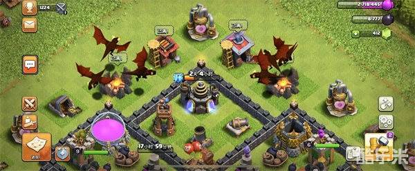 2、在五点方向放置胖子解决炮台,补几个野蛮人和弓箭手,六点钟方向放置胖子和炸弹兵解决下面的炮塔。