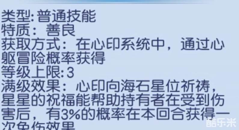 海石,一个等级上限只有三级的心印技能,虽然说在只有3%的概率会出现免伤效果,但是小编认为他的3%,触发的概率已经是相当高了,甚至我怀疑远远不止官方所说的3%那么简单,其实作为一个治疗职业,关键时刻的一次免伤效果,会让本该陷入被动的战局逆转过来。