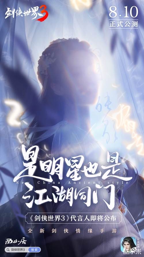 西山居全新国风武侠手游《剑侠世界3》8月10日正式公测,代言人悬念海报今日首曝,神秘唯美的倩影引发终极猜想。当神秘巨星降临,TA会为这片江湖带来什么新鲜事?除此之外公测预热视频首曝江湖五大亮点,新门派、新场景、新玩法...邀各位少侠开启全新江湖之旅!