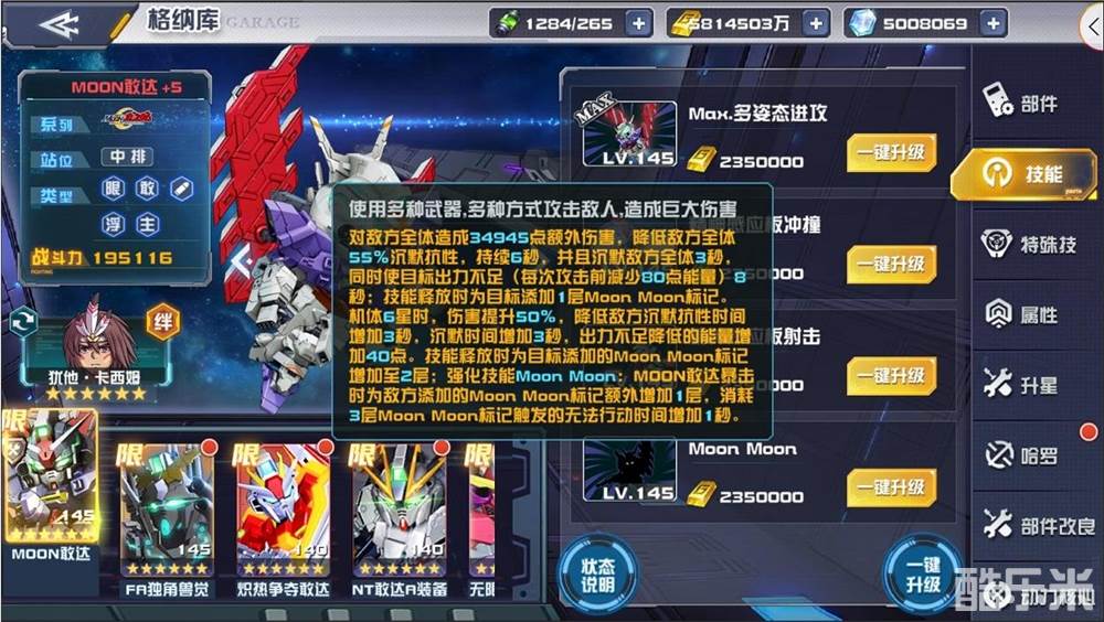 首先来看Moon Moon这一强化技能。MOON敢达暴击时,会对目标添加1层Moon Moon标记,当标记达到3层时,可以使敌方无法行动且持续较长时间。而当我方上阵5台主角型和浮游炮型机体时,MOON敢达每损失20%耐久就会为全队添加护盾,单独上场主角型或浮游炮型机体时又将产生不同效果。