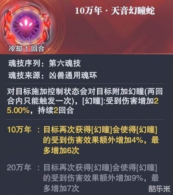 其施加的【幻瞳】状态为受伤提升,基础受伤提升幅度为25%,持续2回合,当然这里的2回合是指对方行动2回合对目标施加的【幻瞳】2回合内只能触发1次,所以如果大家使用的是狐狸的话,这也意味着第1回合狐狸可以【混乱】控制,第2回合随意,第3回合又施加【混乱】控制才能触发其10万年与20万年的进一步受伤提升效果(但到底触发了多少层,敌方身上的状态图标并不会有显示),以此类推如果【幻瞳】状态在对方行动2回合后消失了,那么新施加的【幻瞳】则只有25%的基础受伤提升效果,额外的10万年、20万年增伤效果需要重新叠加,这也意味着我们在战斗中不能让对方身上的【幻瞳】状态消失【天音幻瞳蛇】的增伤为单体增伤,假设使用狐狸的4-1技能群体释放【混乱】,则会随机给1名敌人施加【幻瞳】,并不会多人同时施加【幻瞳】