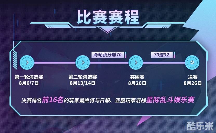 每轮比赛前十分钟,超级联赛及以上等级的参赛玩家将可从大厅入口进入匹配队列,蓄势待发,热血出战!最终,在经历海选混战后,取最好两轮成绩的前70名玩家将成功晋级突围赛,进入更激烈的竞逐,冲击决赛名额,反转星河宇宙!