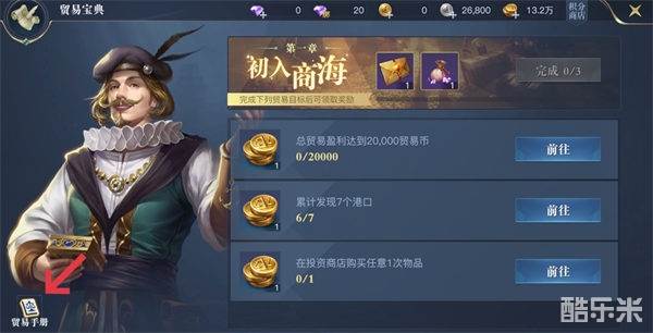 第一章的任务分别是:总盈利达到20000贸易币;累计发现七个港口;在投资商店购买任意一次物品。