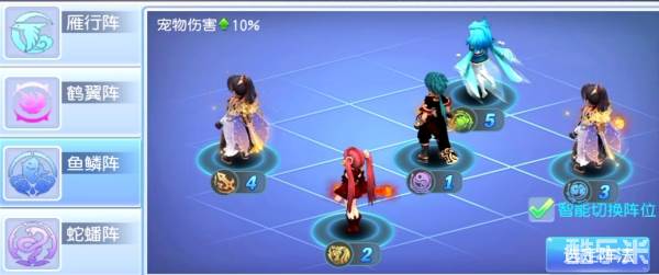 阵法方面我选择的是蛇蟠阵,当然这是因为三辅助的原因,桃花源记内更多的是三输出队伍,那么请选择鱼鳞阵!开局宠物三辅助(轻雪梅灵/小螺仙都可以),两单攻!记得单攻连击宠物不可以带隐身!
