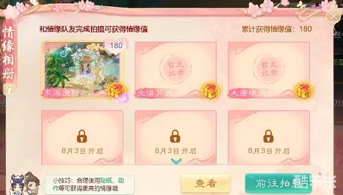 1.每天开放不同地图拍照,与结缘队友组队前往对应地图拍照可获得情缘值。首次拍照获得奖励。