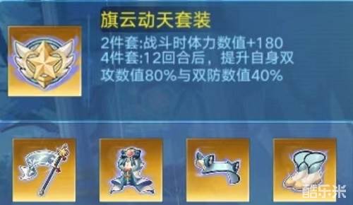 这个装备是适合后期的装备,在打副本的时候需要拖到后期去增加自己双攻和双防数值,基本上12回合后就成型了,在12回合之前还是稍微有点弱的,因此就需要辅助去保一下;在打竞技场的时候也是拖后期去打,比如1V1搭配逆元之主的特性,自己体力因为旗云装的加成和专属特性加成又会比原来满速的其他装备增加的血量多