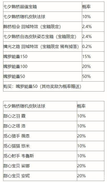 七夕鹊桥超值宝箱,打开70次至少掉落7个七夕鹊桥随机皮肤法球。七夕鹊桥随机皮肤法球概率始终为10%。
