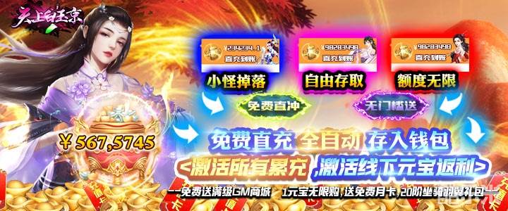 天上白玉京(GM免费直充)免费直充全自动存入钱包,钱包额度可直接在充值界面充值,充值激活所有累充,激活线下元宝返利!