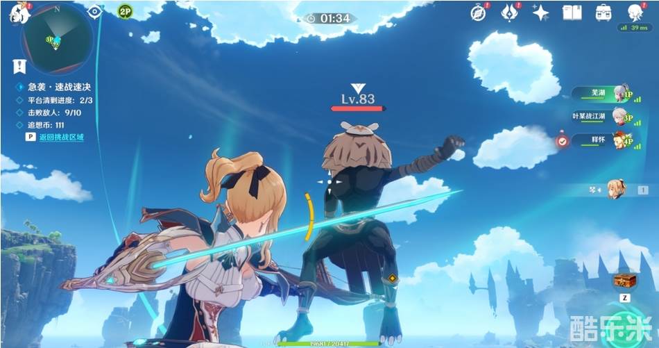 4.击落平台的方式击败3名敌人,在浮空平台打怪的时候,不要直接打掉,把它们打落平台即可,建议用琴的蓄力e技能。