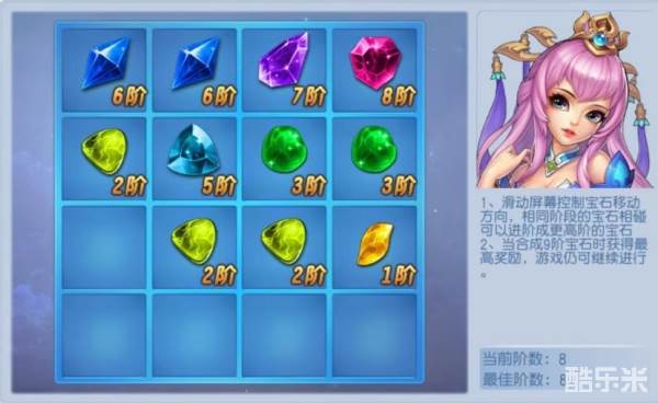 规则很简单:通过手指上下左右滑动,每次控制所有宝石向同一个方向运动,两个相同等阶的宝石撞在一起之后合并成为更高级的宝石。