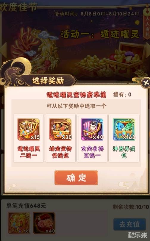 在活动期间少年们单笔充值至指定金额,即可获得遁迹曜灵二选一、焰金宝物任选包、玄金名将五选一、神器养成包、玫瑰花等资源: