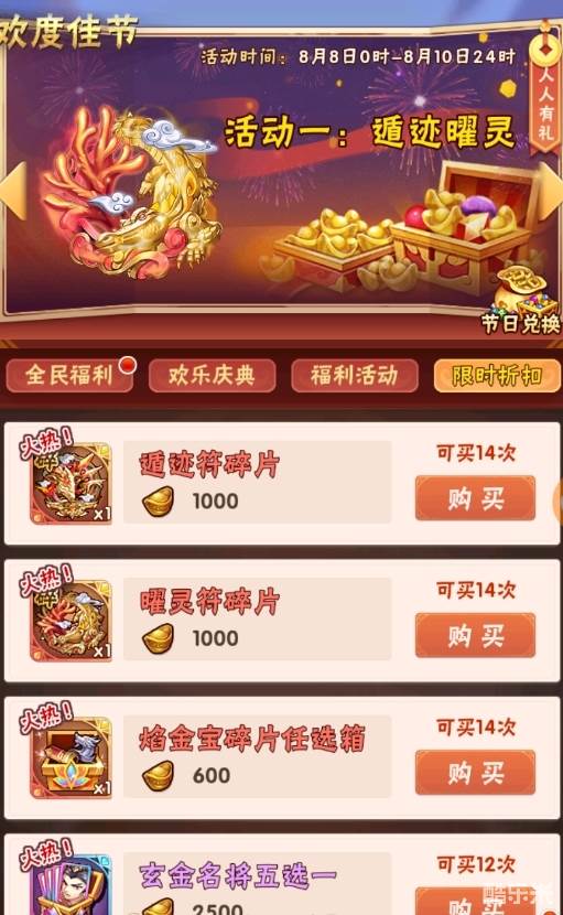 七夕欢庆折扣商店限时促销,折扣低至2折,用元宝就能购买大量稀缺资源!快来选购吧。