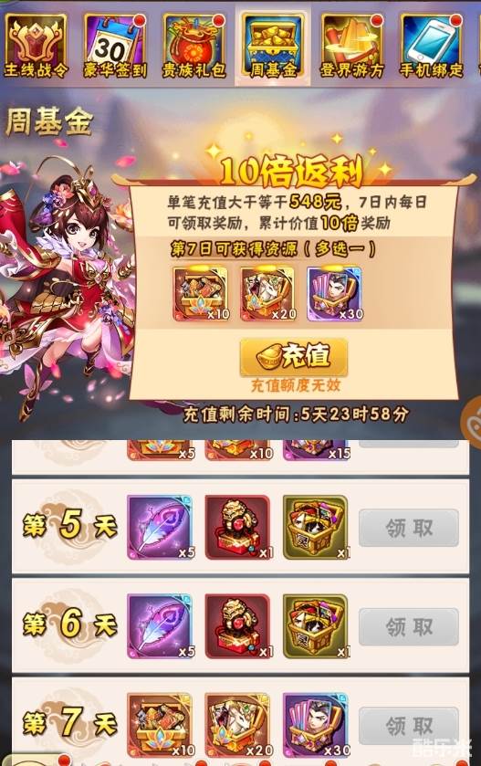 活动规则:在活动期间,7天内任意1天充值548及以上,都能立即激活周基金,领取当前天数所有奖励!7天内可获得如下奖励: