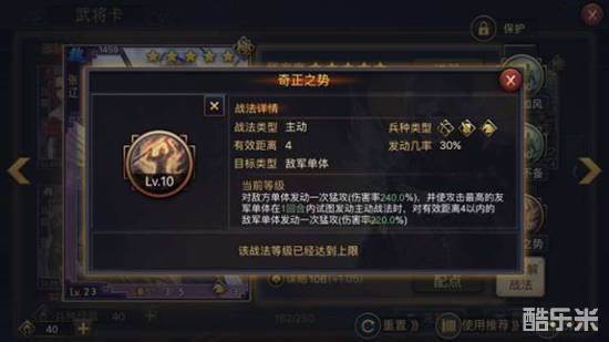 那么,如果这个战法释放在攻击最高武将主动战法后(通俗讲就是佩戴奇正的武将没有先手技能并且速度低于攻击最高的武将),这个战法二段伤害还会不会发动?答案是肯定的,只不过这个效果就会在下回合发动。这样以来,在特定条件下,比如你在第八回合发动奇正,你的速度慢于攻击最高的武将,这样来你就丢失了一个二段伤害。不过这些问题通过武将搭配以及配点大部分都可以解决。