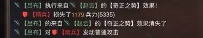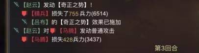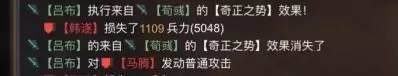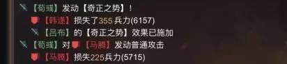 上图为同一场战斗中战法伤害的一个对比。可以看出荀彧发动奇正的伤害要远远低于吕布带来的二段伤害。