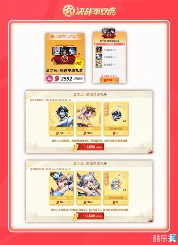 8月5日维护后-8月25日,【夏之风·甄选皮肤礼盒】上架杂货铺,限时9折特惠!使用后即可获得夏之风系列皮肤:妖刀姬「热海白珊」、青行灯「悠阳夏谭」、首无「激浪逐夏」。