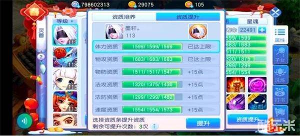 通过洗练获得满意的成长以及资质,培养宝宝之路就要开始了,首先将宝宝资质面板提升满。提升次数有限,一定要合理的安排,保证收益最大化。