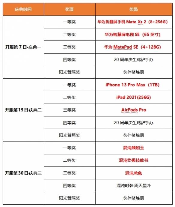 作为大话二十周年专服,超级新服【二十年华】将为三界侠士送出最丰厚的活动福利,和大家一同感恩这些年相伴度过的情义年华。在新服开启后,不但将有丰富的新服专属活动降临,更将在开服后第7天、第15天和第30天送出海量豪礼!侠士来玩新服就有机会获得华为折叠屏手机Mate Xs 2(8+256G)、华为智慧屏电视SE(65英寸)、华为MatePad SE(4+128G)、iPhone 13 Pro Max(1TB)、iPad 2021(256G)等实物好礼,更有机会赢得混沌颜如玉、混沌终极技能书、混沌龙兔等可交易的珍稀道具奖励!