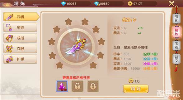 点击精炼,可使用铜币以及精炼石精炼装备,提升战力。