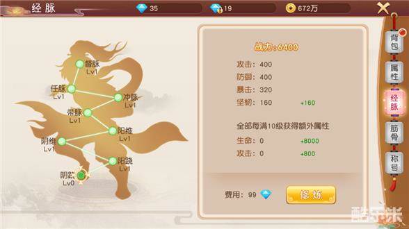经脉修炼和筋骨修炼首次是免费的,后续每次少量钻石即可激活大量属性和战力加成,提升到一定等级后还可激活额外属性。