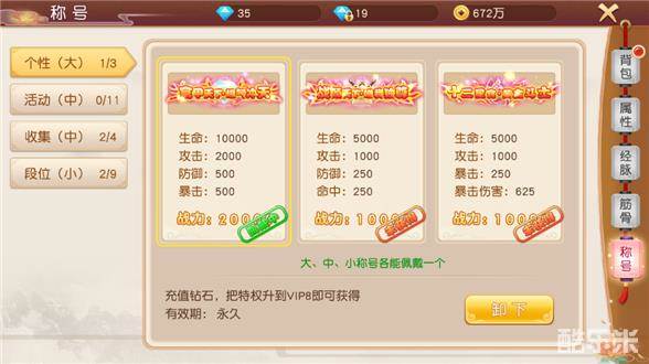 称号分为四类,个性、活动、收集、段位,称号同样带来大量属性和战力加成,每个类型称号都有大小之分,作为牛逼哄哄的你当然会喜欢越大越好吧!