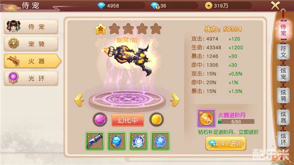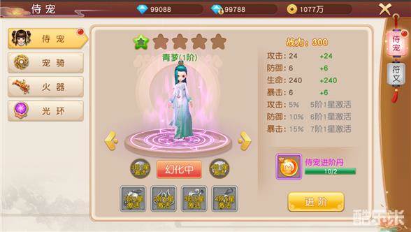 进阶或者强化侍宠可提升人物战力,升级对应的符文可提升对应侍宠或火器等各项数值,还能提升战力。
