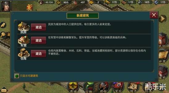 可对已经建造的建筑进行升级和拆除,选择拆除一级将返还部分资源,选择直接拆毁不返还资源。除了城内建筑,城外还资源地可以建造,有粮食、木材、石料、铁锭4种资源: