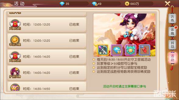 在历练里面会有个“活动”这里基本囊括了游戏里所有限制玩法,大家可以跟着这个时间表走一遍,走完之后你会发现背包满满哦!