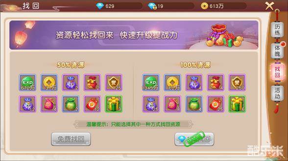 玩家每日还可以通过找回的功能来找回属于你的资源,使用少量钻石还能让资源翻倍获得哦。