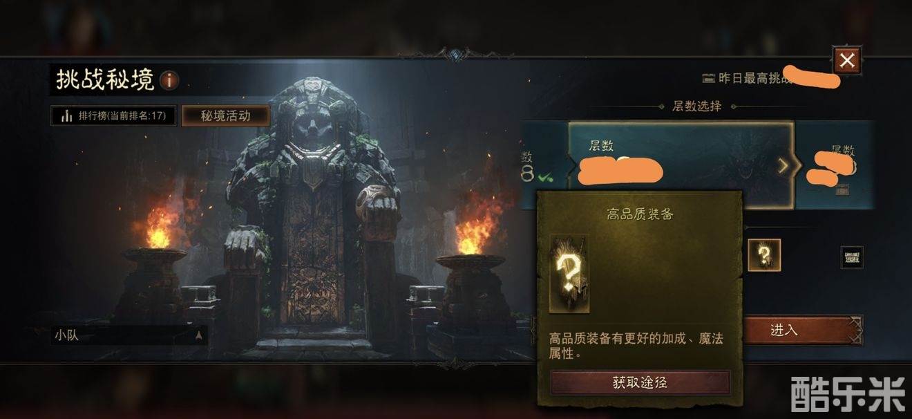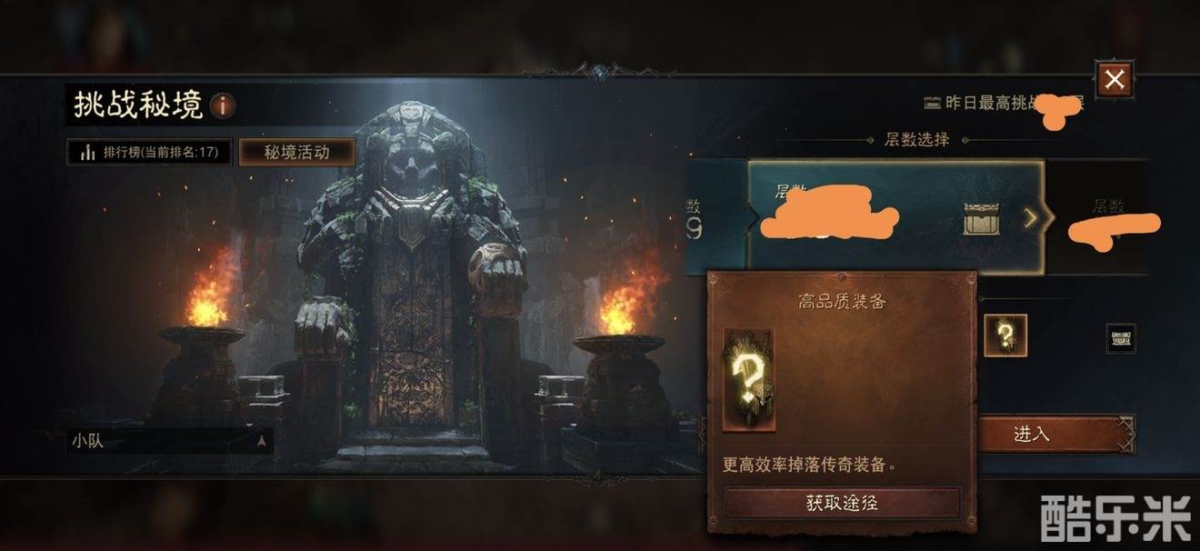 请仔细点开挑战秘境每层收益下面的内容研究一下,每层都有一个问号装备,写着“高品质装备有更好的加成,魔法属性”,而有的整数层还写着“更高效率掉落传奇装备”。这什么意思呢?意思就是你挑战秘境层数越高,全局掉落装备传奇几率越高,掉落装备属性越高。