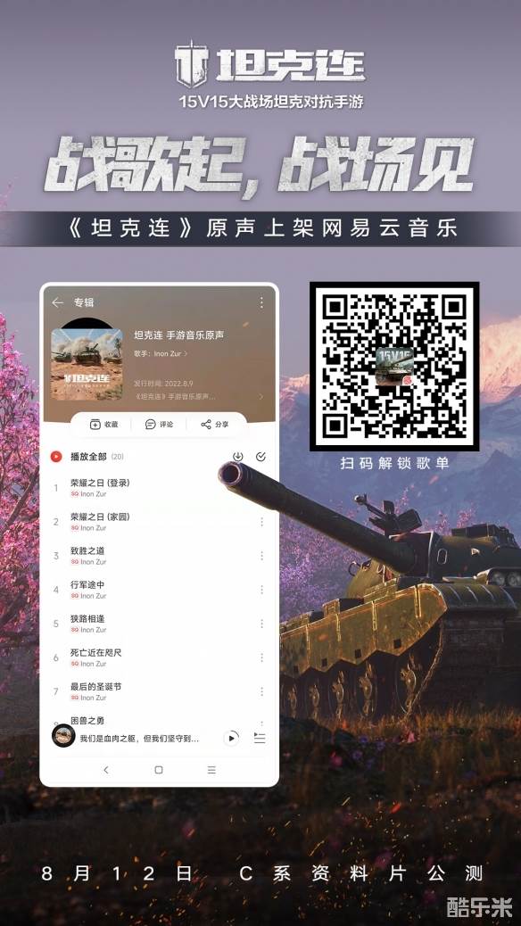 8月12日,《坦克连》C系坦克资料片将迎来公测。《坦克连》音乐原声于今日上线网易云音乐,为15V15坦克大战场坦克对抗,营造最热血激昂的氛围!各位长官可扫码或在云音乐内搜索关键词:坦克连原声,在专辑类别内将整套专辑加入你的专属收藏!