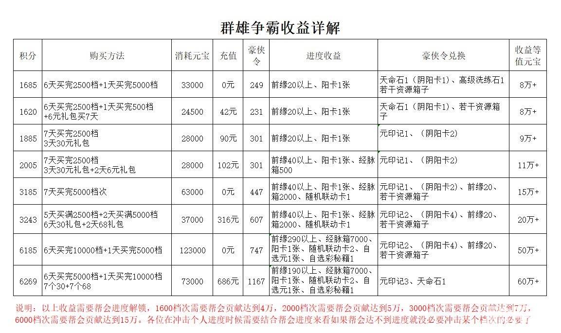 由于刚刚结束七夕活动,多数小伙伴都梭哈了七夕活动,导致现在手里的元宝捉襟见肘(氪金大佬和超级屯屯佬除外),因此这次的活动要元宝拉满(12.3万)就有点吃力,并且还需要考虑帮派能力是否能完成15万的帮派进度。因为这是一条双线玩法,积分和兑换综合起来,故而计算起来比较繁琐,且个人情况各公会情况都不一样,因此下面只能给出几个比较实惠的购买技巧(这里默认工会进度都能达到对应档次,且进度奖励豪侠令也计算在内),各位小伙伴看能力和自身情况选择: