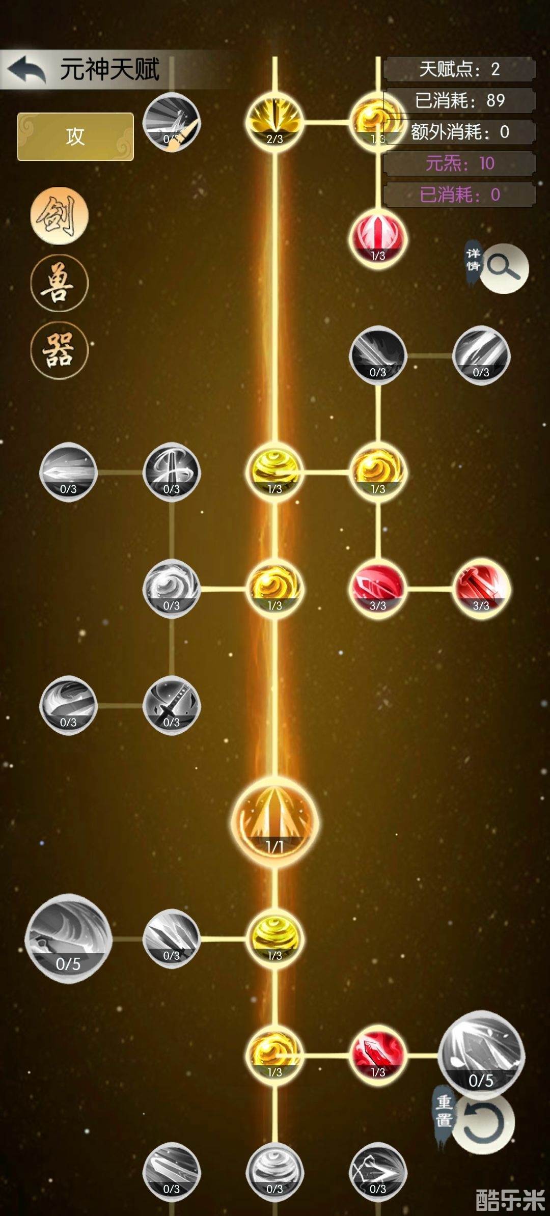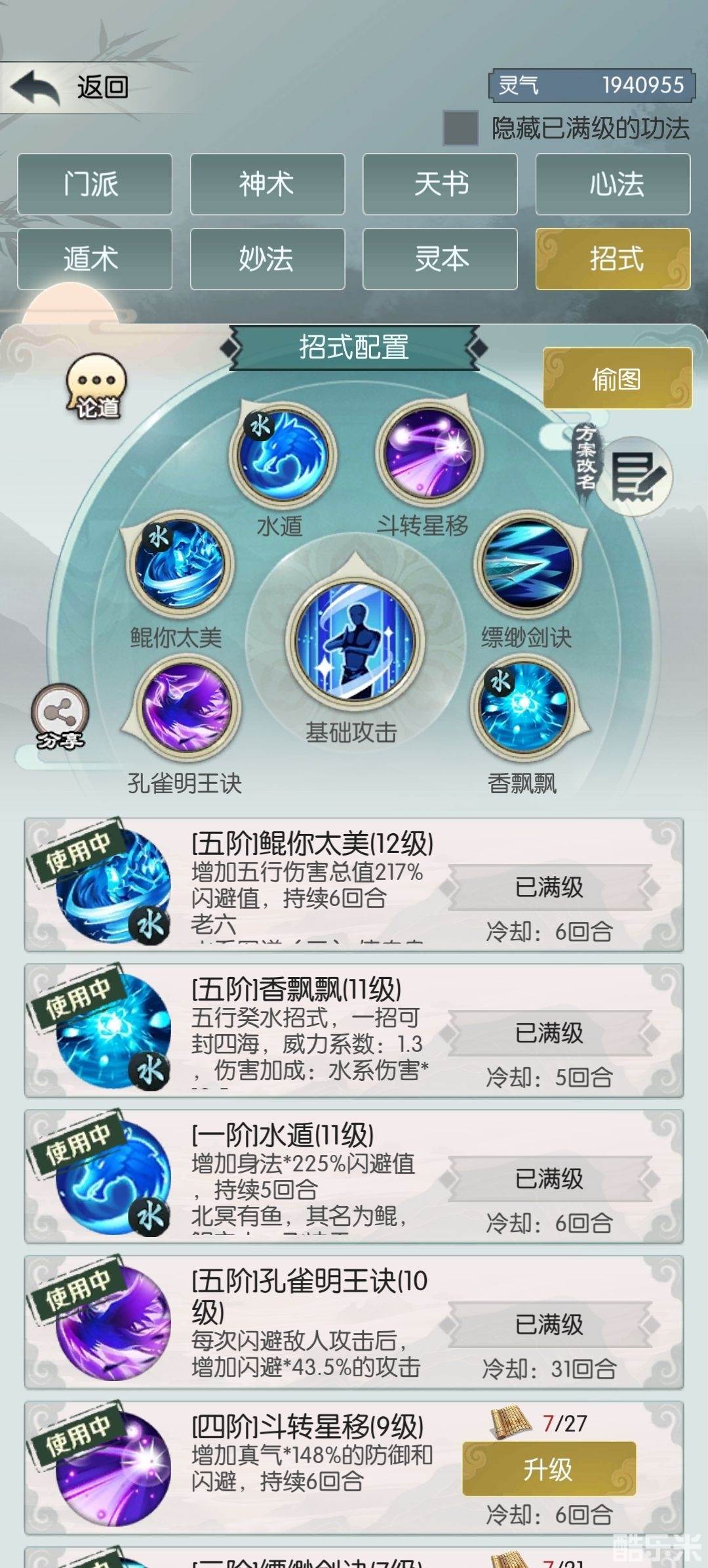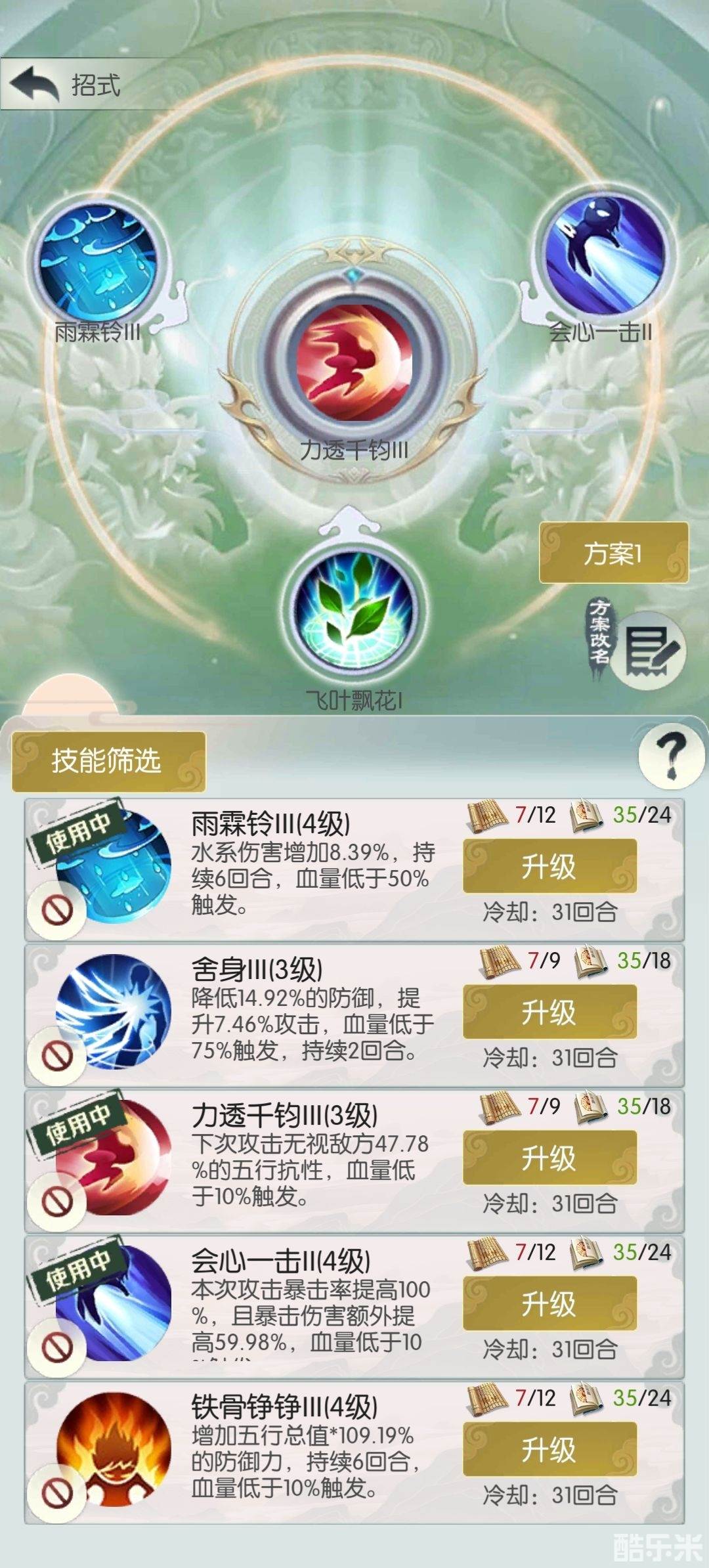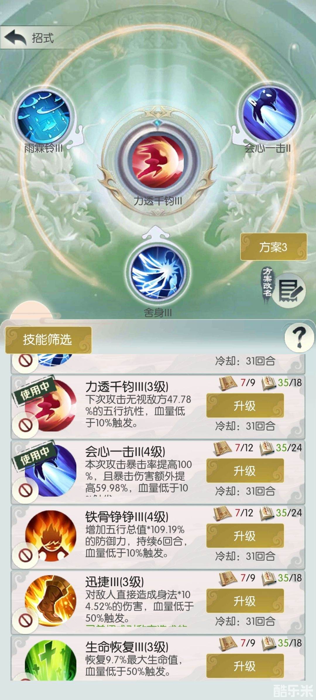 因为我天赋点不足没有开启,这个适合大多数人,天赋点到了直接带会心一击,当然三星会心是最好的,给第五招式,第六回合就会直接触发,剑带方圆,抗五轮伤害运气好闪了几次能多叠加伤害
