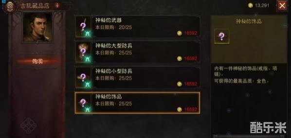当前阶段建议各位抽神秘的武器/神秘的大型防具/神秘的饰品;虽然抽小型防具和饰品的最高品质都仅为金色,但是由于饰品中的绿装戒指在目前的服务器等级下还无法获取/使用,因此饰品是值得一抽的。