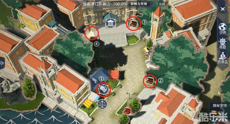 4号宝物在总督府的左侧,目前版本地图上收集后有显示BUG,下方的宝箱位置是没有的,实际上在总督府门口左侧红圈处,直接走到对应的位置可以看到宝箱。如图