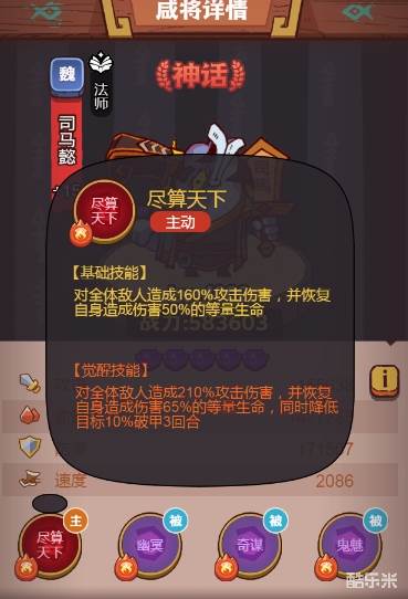 阵容思路:司马懿大招有恢复站一号位吸收伤害,而且伤害越打越高只要活下去到了后几回合便是神一样的存在,诸葛亮看脸控制,华佗回血,太史慈持续增伤,吕布开心魔收拾残局;这套伤害较高,但是容错率低。
