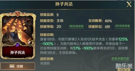 【孙子兵法】是一个战略价值很高的技能,其效果多样,既有高额的输出,也有移除禁疗的辅助效果,还有概率使自带技能再次发动,可以说是一个非常全面的技能,适用于多种场景。