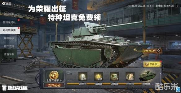 福利二:完成每日任务和专属任务,为全服累计荣耀积分,解锁多重礼物,最终大奖为C系III级特种战车LVT ZiS-2;