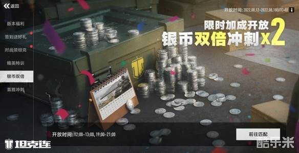 福利六:8月12日至18日,每日固定时段参与15V15战斗且达成指定条件,可享受双倍银币收益,让你后勤有保障,任性买买买!