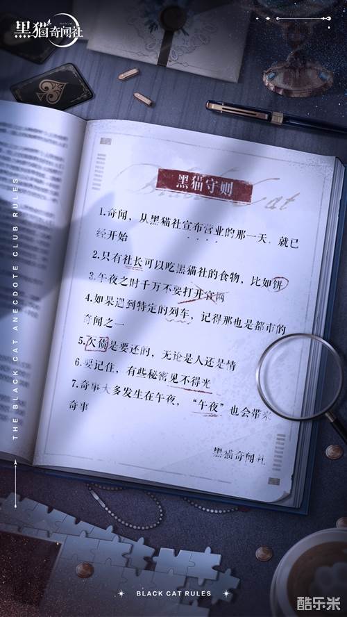 当然,既然雾城之中传闻很多,那么即便是作为社长大人,也有许多规则是需要遵守的。毕竟,“黑猫守则”第一条就说了,奇闻可是从今天就正式开启。当你通读了“黑猫守则”有发现其中的端倪吗?或许每一句话都是一个谜题,而谜底不仅与雾城之中的传闻真相有关,更是一份颇有意义的惊喜。