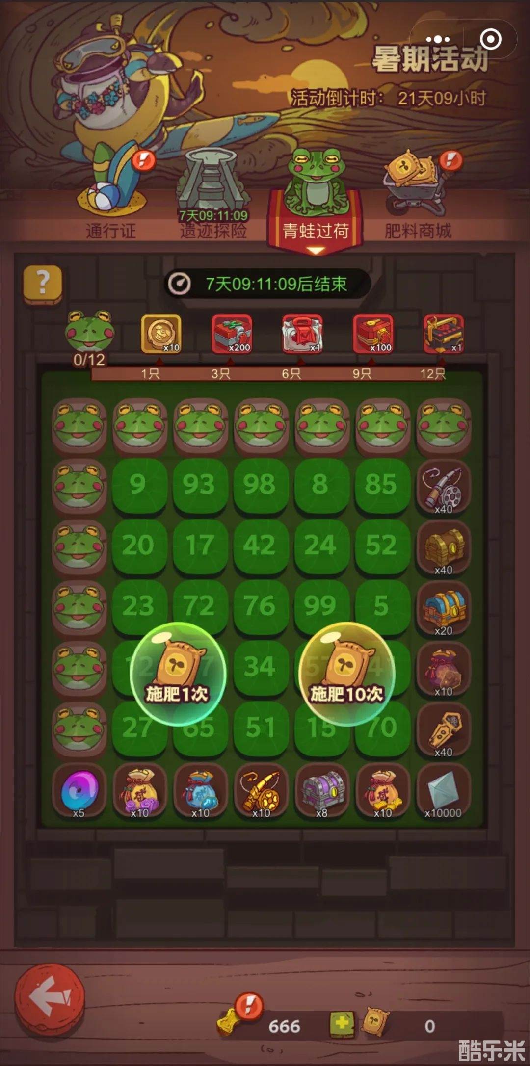 本次不再是那个挖矿了,更新为[青蛙过荷],需要使用[有机肥料]施肥,施肥有几率让荷叶长出来,施肥会有奖励,都是一些资源奖励,参考挖矿,如果荷叶连成一条线就会获得大奖,这个不知道有没有规律,还是全靠运气呢。