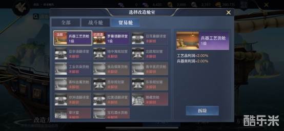 我们在建造船只以后,需要在船舱进行改造,这里的改造可以分为战斗和贸易两种舰队。战斗舰队的船舱改造可以增加各项战斗性能,比如高级火炮舱,可以增加船只高额攻击力;像医疗室则是增加船只受到的治疗效果属性加成,根据职业的需求,我们可以自由搭配。贸易舱可以增加交易属性,比如兵器工艺货舱,可以增加工艺品和兵器类物品的利润;而食品烟草舱则增加食品类和嗜好品类的利润,通过这些属性加成,贸易能力可以大幅度提升。