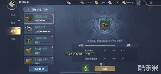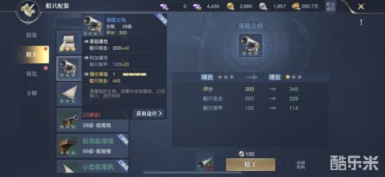 接下来是强化,船只强化是提升船装的属性,需要注意,同一部位的船装再更换时自动继承强化等级和属性,这样一来就不会造成我们替换船装时,造成材料浪费的情况了。我们在强化船装时需要消耗银币和强化源石,在到达一定强化次数后,需要进行突破,这时会消耗突破石。需要注意,我们将一定数量的船装强化至指定阶段时,还可以激活精进效果,增加更多额外属性。因此初级的强化,我们可以雨露均沾,将全部船装提升至对应等级,这样增加的属性会比单独强化某一个要高很多。在中后期,再根据角色的特性,侧重去提升所需要的属性即可。
